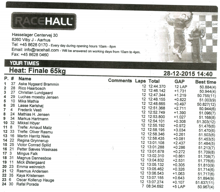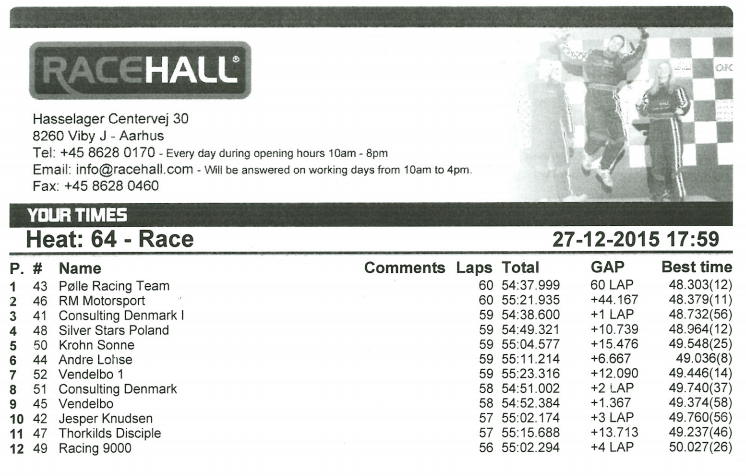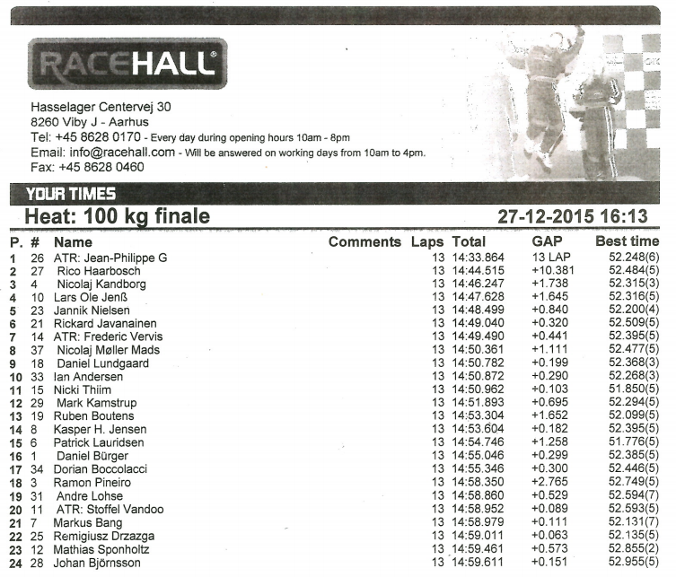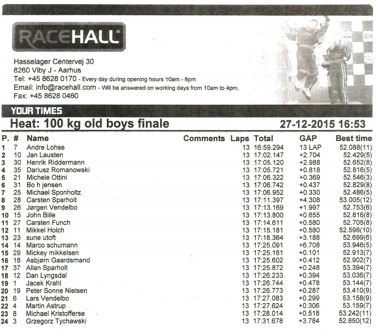 In de zomer van 2013 was het circuit van Racehall nog gastheer voor het Kart World Championship (KWC), en sindsdien zijn er wel altijd enkele ‘bekenden’ die ook eind december de weg naar Aarhus vinden. De hal is de grootste indoor-hal van Europa (vroeger een overdekt voetbalplein), en huisvest nu dus een van de grootste indoorkartings van Europa, vooral op gebied van breedte van de baan.