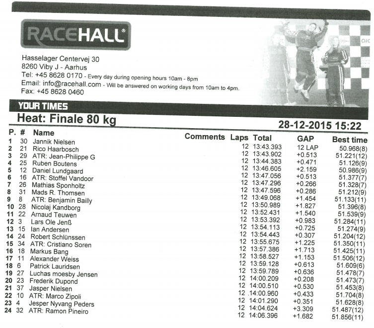De resultatenbladen zijn nog die van de finalerace, zonder de toegekende penalties etc. voor mensen die bv. onder gewicht zaten of bestraft werden met een time-penalty voor een verkeerd manoeuvre… Niet volledig correct dus naar de uiteindelijke uitslag toe, maar beter dan niets.